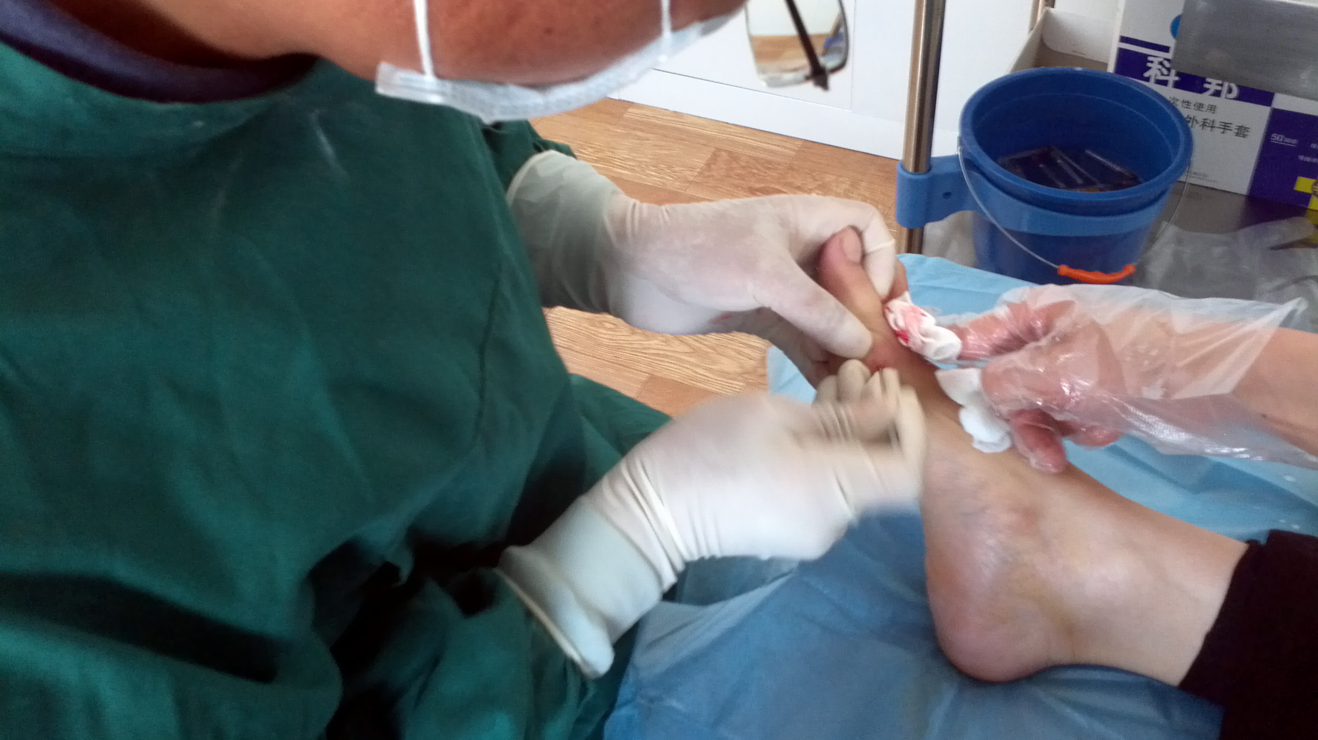 足部踇囊炎多为踇外翻伴随现象。舒针针眼闭式微创术治疗踇囊炎一般均可一次达到预期效果。施术术式为:术灶周缘皮肤及趾间无菌消毒,选普通Ⅲ型1号舒针在跖趾关节切线缘45度角斜行进针,破皮开路后调整舒针针刃至皮下纤维层充分划割开囊壁,注意针刃位置必须在跖骨切线位或斜向深入至趾神经血管下施术,出针后挤干净囊内粘着状液体,再选换多功能舒针中针锯将部分增生纤维组织锯割带出,使囊壁完全撕裂破坏,再用针勺沿开路针道伸入囊内刮除未挤干净的囊液和撕开的部分囊壁纤维组织,充分清理增生肥厚的囊壁后,在术灶部位注射镇痛复合液1ml,针眼及术灶区域无菌敷料块加压包扎,以防渗出和血肿。术后第三日解除加压敷料后改用创可贴覆盖针孔,一般都可达到一次治愈。